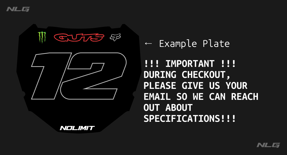 Fully customizable number plate decal with your choice of number, colors, and sponsor logos. Available in regular, holographic, or sparkle finish.